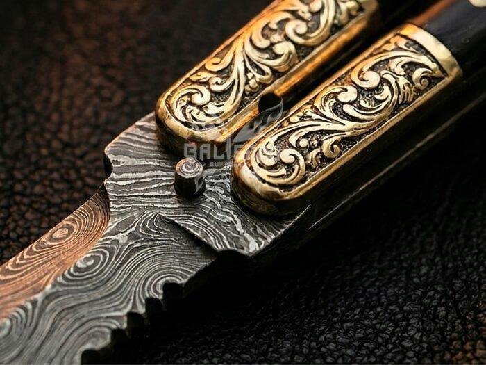 Handmade Damascus Steel Balisong Knife| Black Horn & Brase Engraved Bolsters Handle | Premium Butterfly Knife with Leather Sheath BF-145