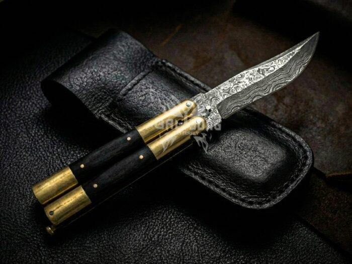 Handmade Damascus Steel Balisong Knife| Micarta & Brase Bolsters Handle | Premium Butterfly Knife with Leather Sheath BF-155