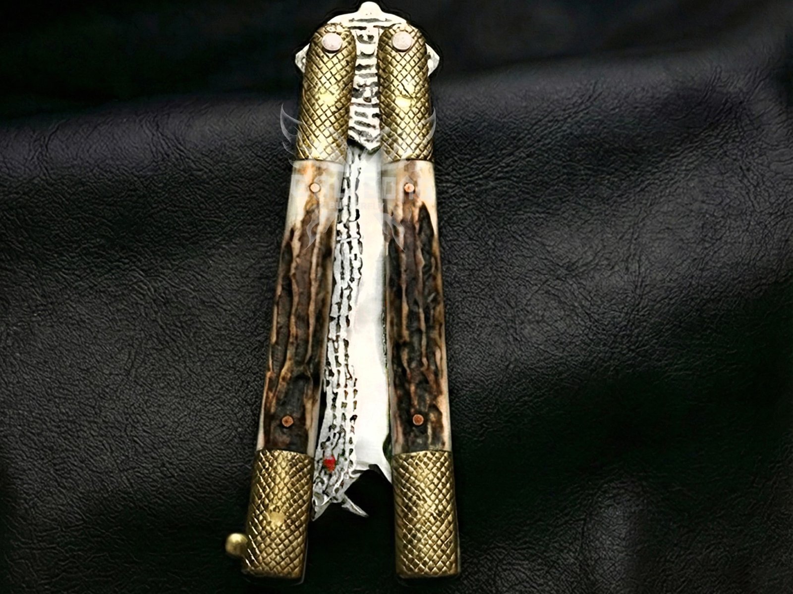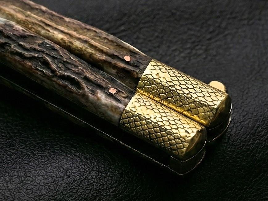 Hand Forged D2 Steel Balisong Snake Blade Knife| Stag & Brase Engraved Bolsters Handle | Premium Butterfly Knife with Snake Shape Leather Sheath BF-149
