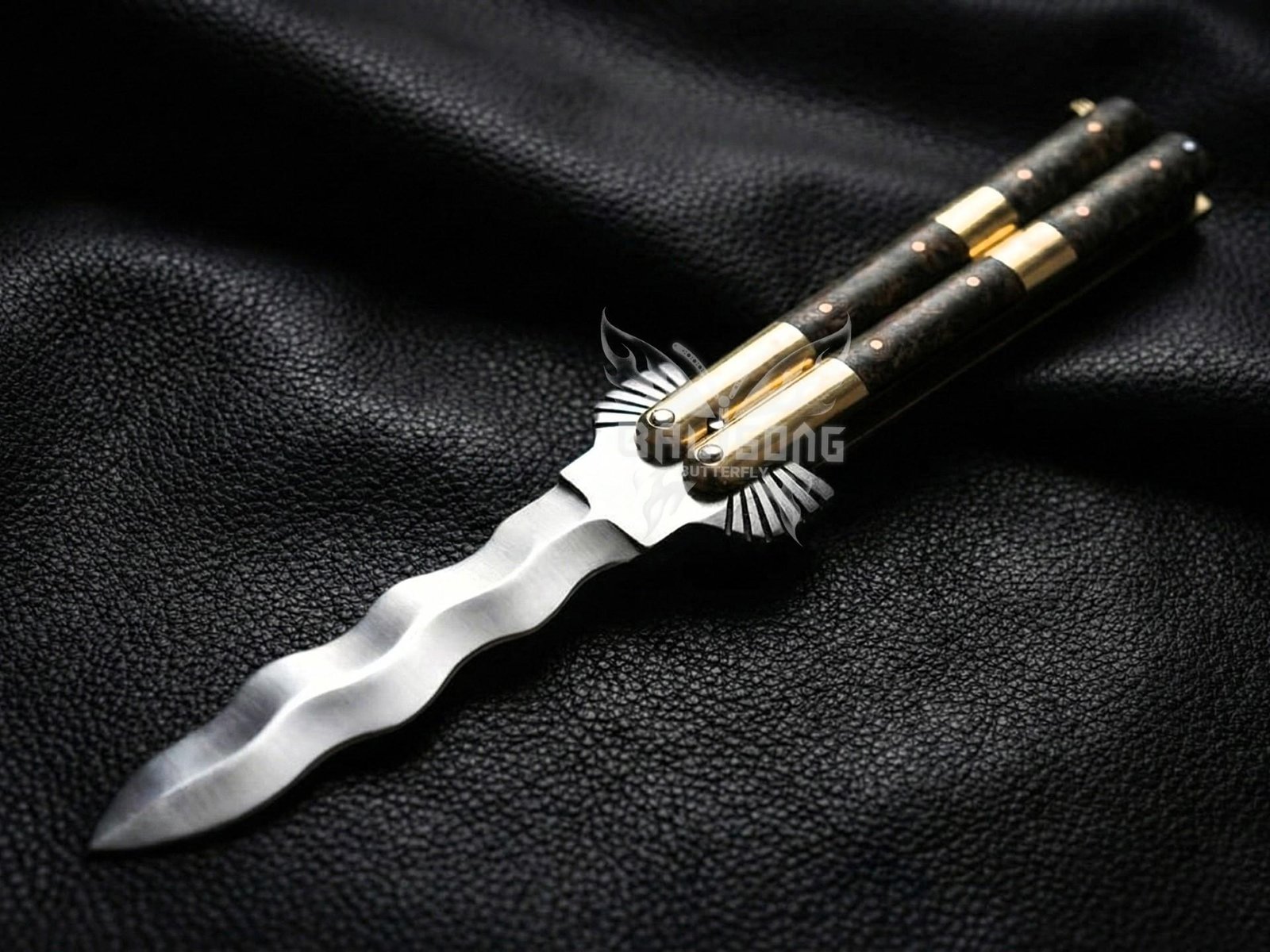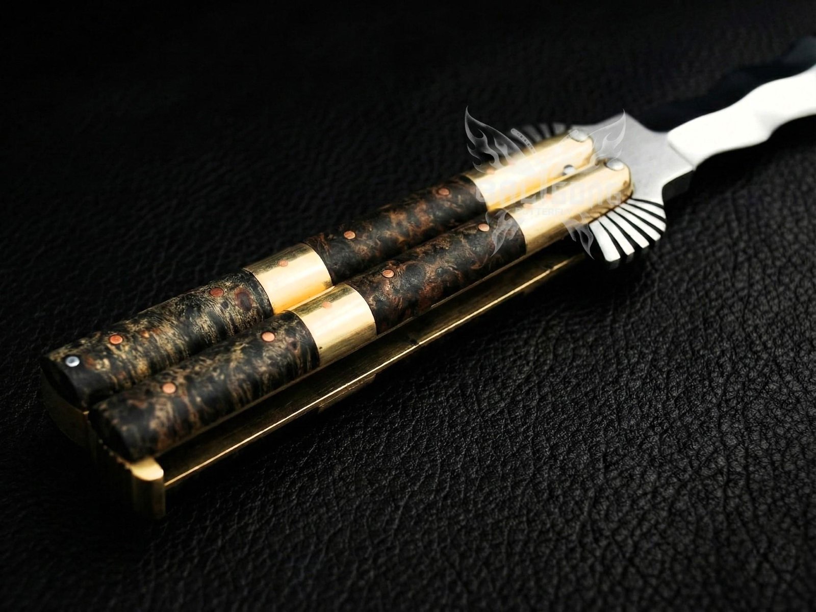 The handle is crafted from natural rosewood, complemented by solid brass bolsters, providing a luxurious feel, superior grip, and excellent balance during flipping or display. Each knife is handmade, ensuring unique character and attention to detail that mass-produced knives cannot match.