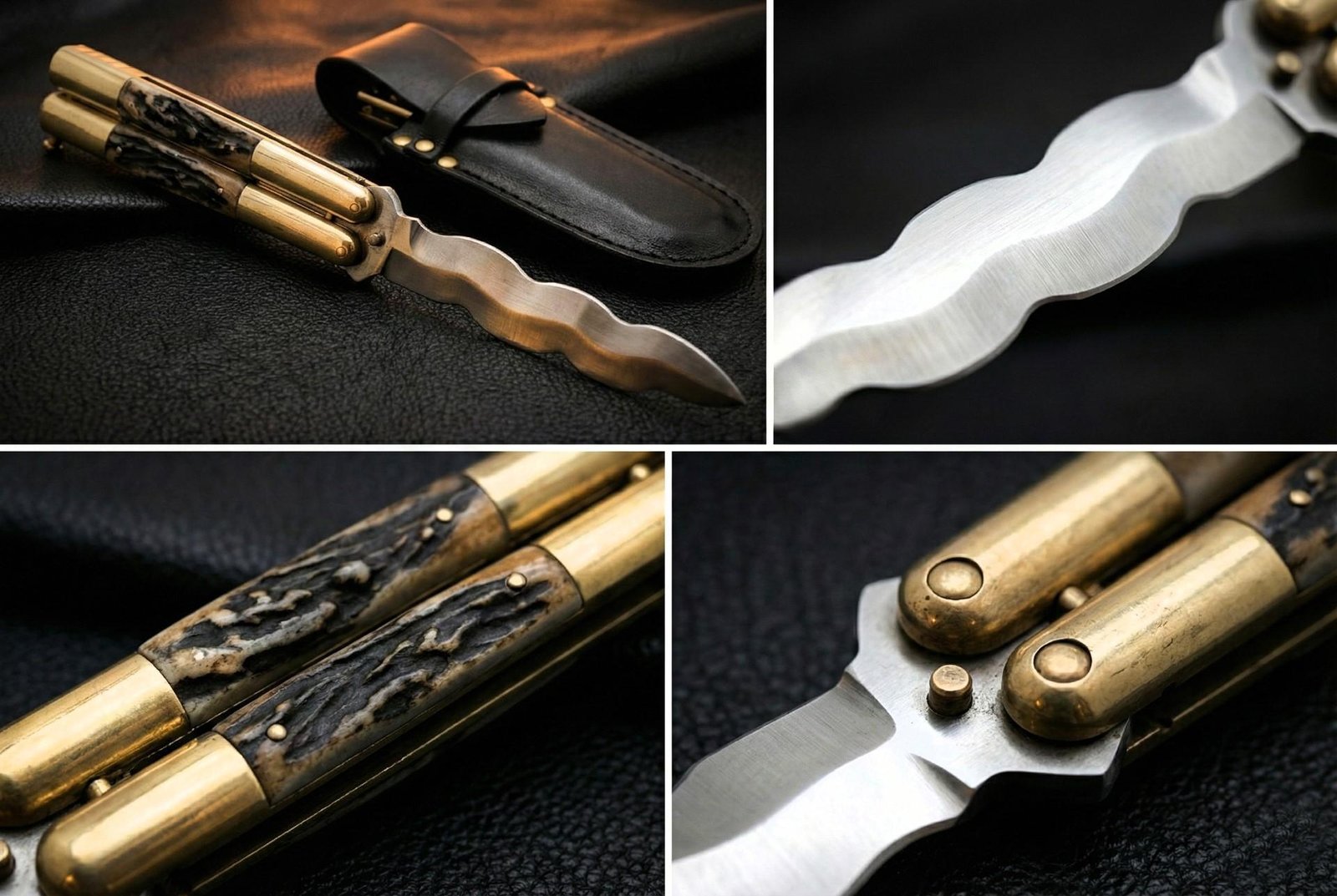 The handle features authentic stag scales paired with solid brass bolsters, delivering a perfect fusion of traditional craftsmanship and modern tactical design. The natural stag texture provides a secure grip, while brass bolsters add strength, balance, and a luxurious finish. Smooth action and solid construction make this butterfly knife ideal for controlled flipping and premium display.
