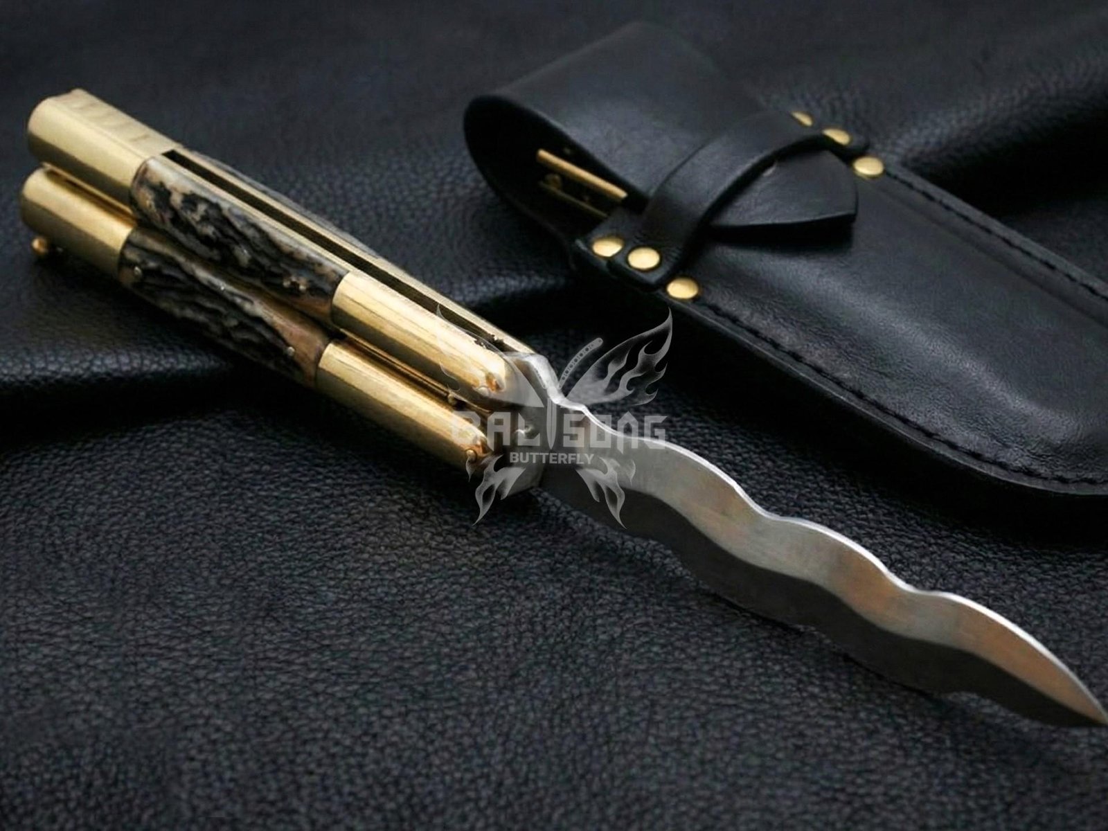 [Handmade D2 Steel Balisong Double Edge Knife| Stag & Brase Bolsters Handle | Premium Butterfly Knife with Leather Sheath BF-152