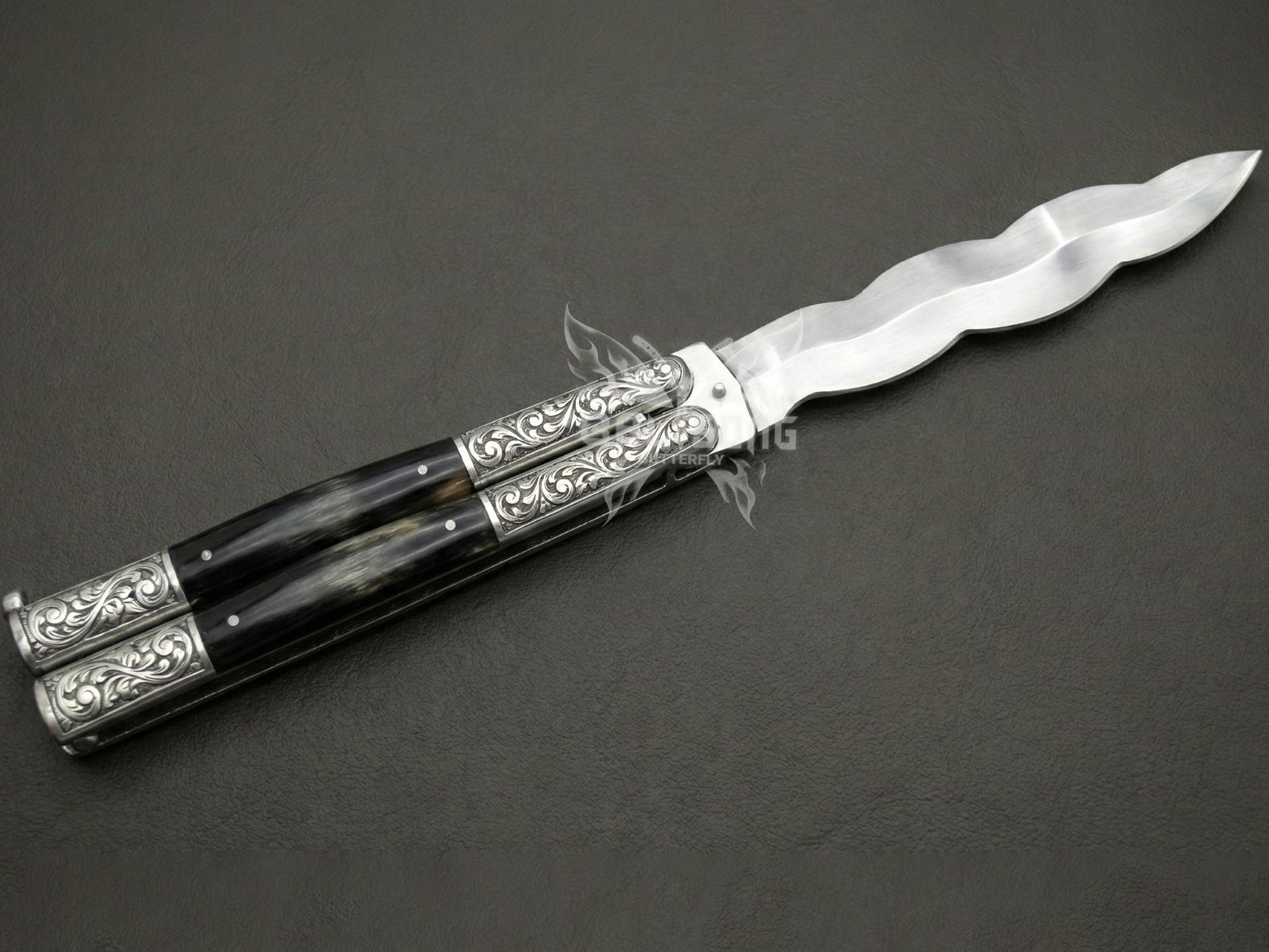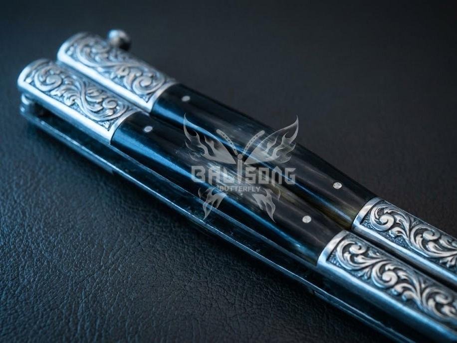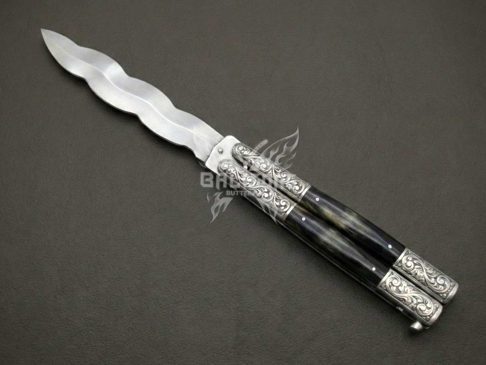 Handmade D2 Steel Balisong Double Edge Knife| Black Horn & Steel Engraved Bolsters Handle | Premium Butterfly Knife with Leather Sheath BF-139