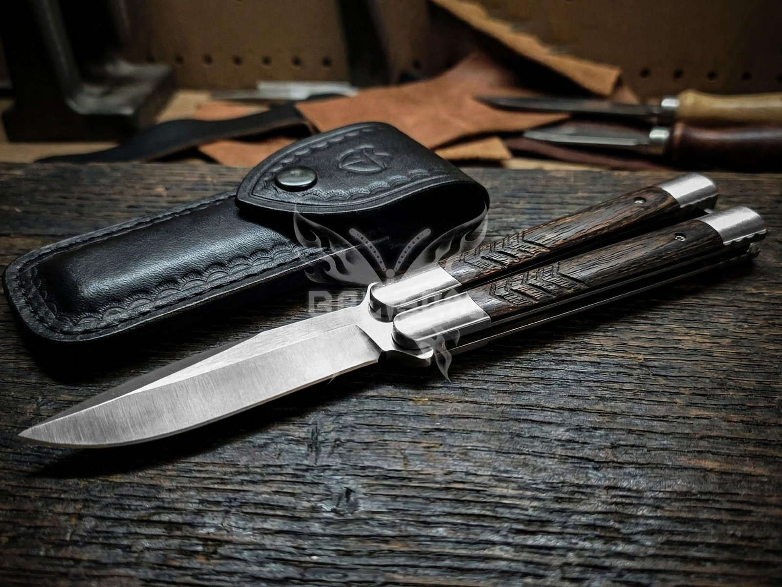The handle features luxurious engraved Wenge wood paired with solid steel bolsters, delivering both durability and a refined aesthetic. Whether used for camping, hunting, survival, or display, this handcrafted balisong knife reflects precision engineering and timeless design. Each knife is carefully finished and paired with a genuine leather sheath, making it a complete premium gift package.