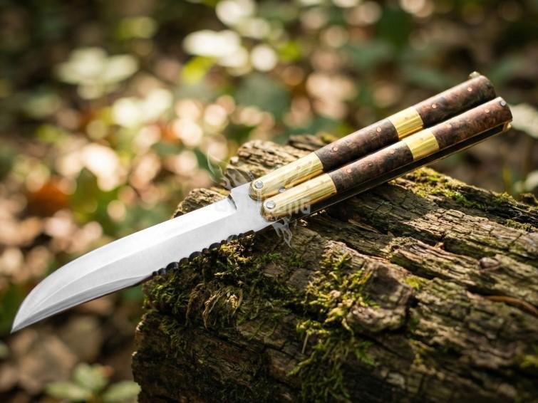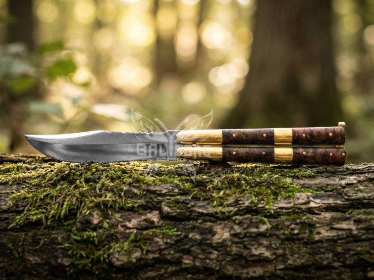 The handle is crafted from natural rosewood, offering a rich, elegant look and a comfortable grip. Solid brass bolsters enhance durability while adding a classic, luxury finish that elevates the knife’s overall aesthetics. Smooth action and balanced weight make this butterfly knife ideal for controlled flipping and confident handling.