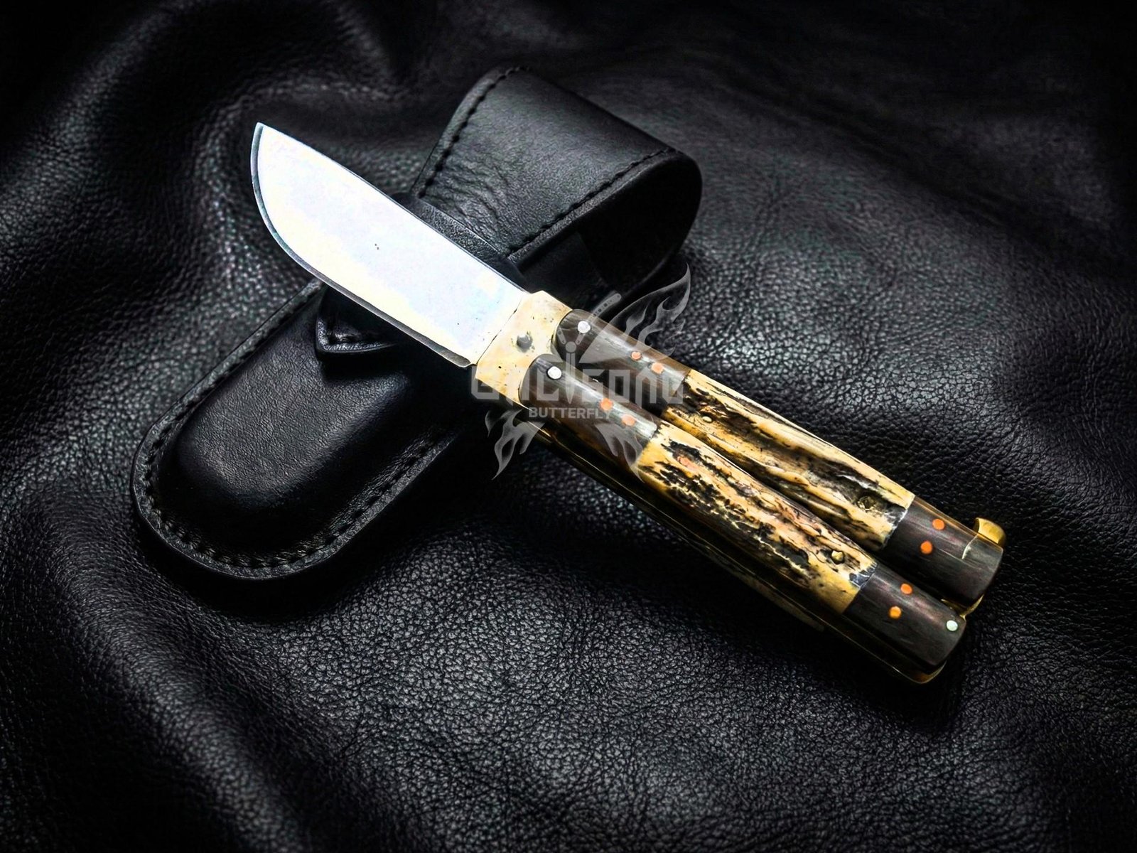 Handmade D2 Steel Balisong Knife| Stag & Rose Wood Handle| Premium Butterfly Knife with Leather Sheath BF-158