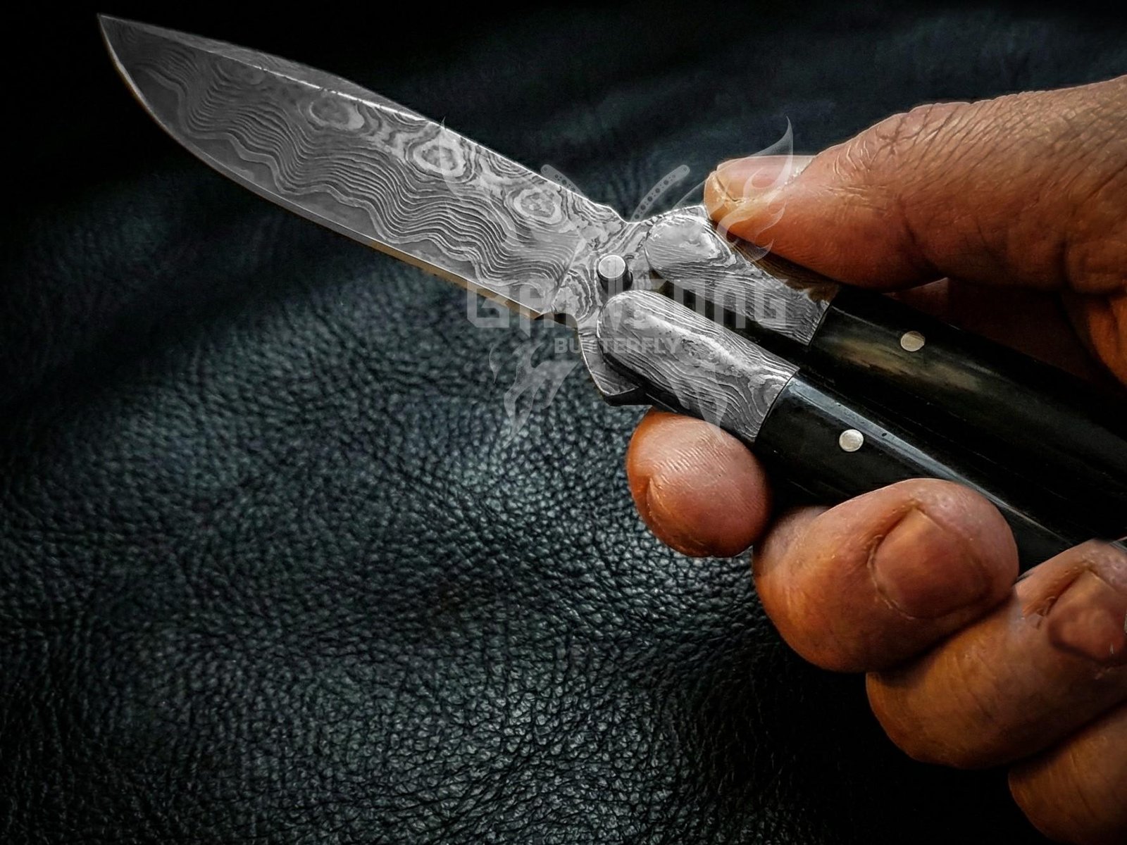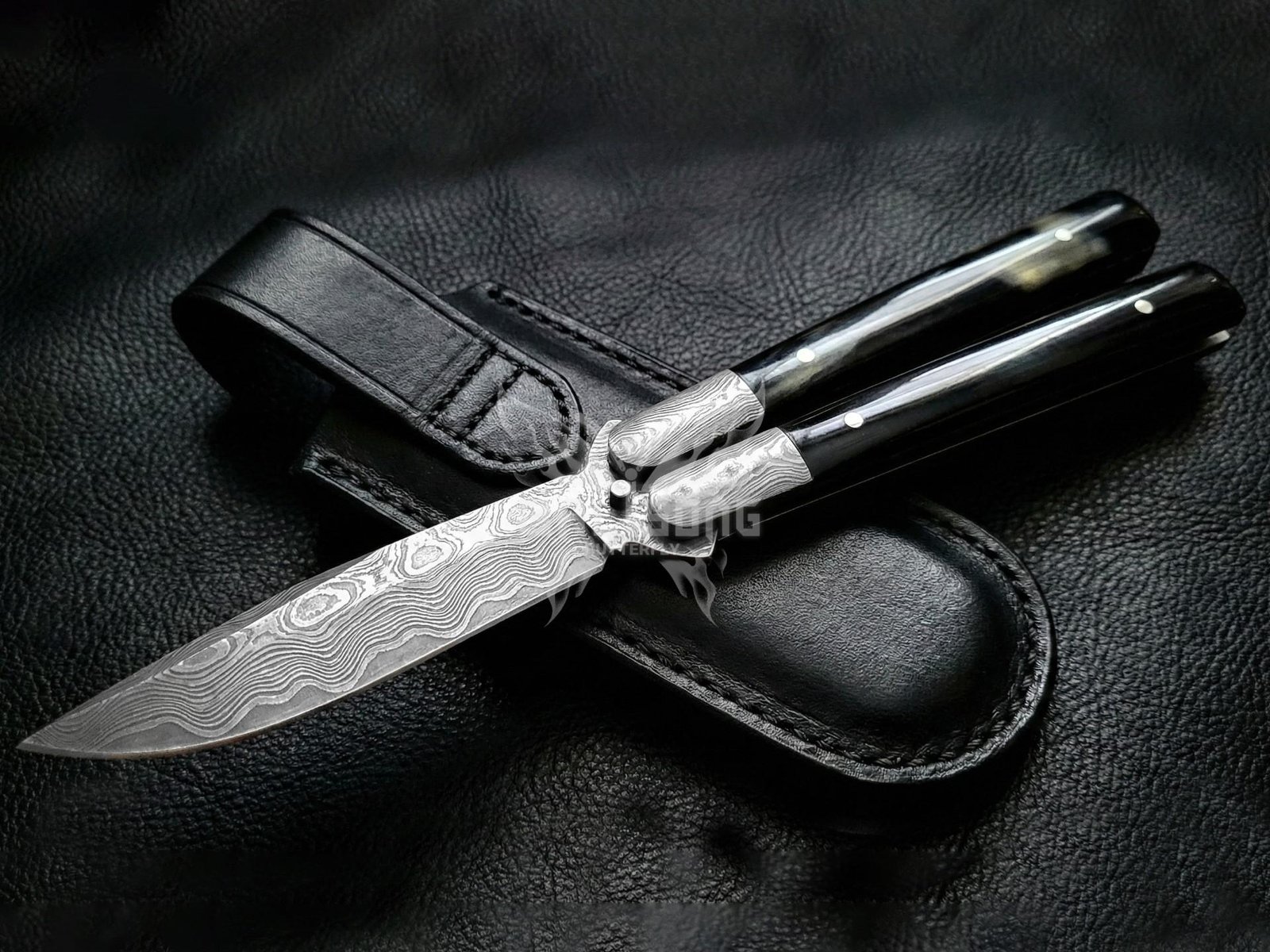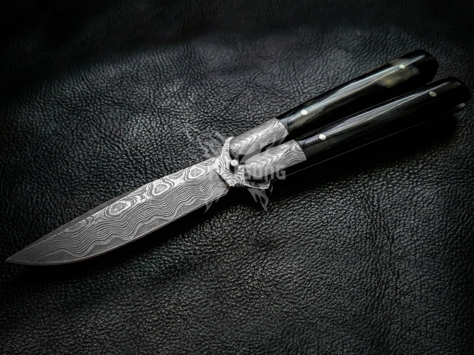 The Black Horn handle combined with Damascus steel bolsters delivers a bold, elegant look while offering a secure, ergonomic grip for smooth flipping and reliable control. Whether you’re using it for EDC (Everyday Carry), camping, hunting, or display, this premium butterfly knife offers unmatched durability, balance, and visual appeal.